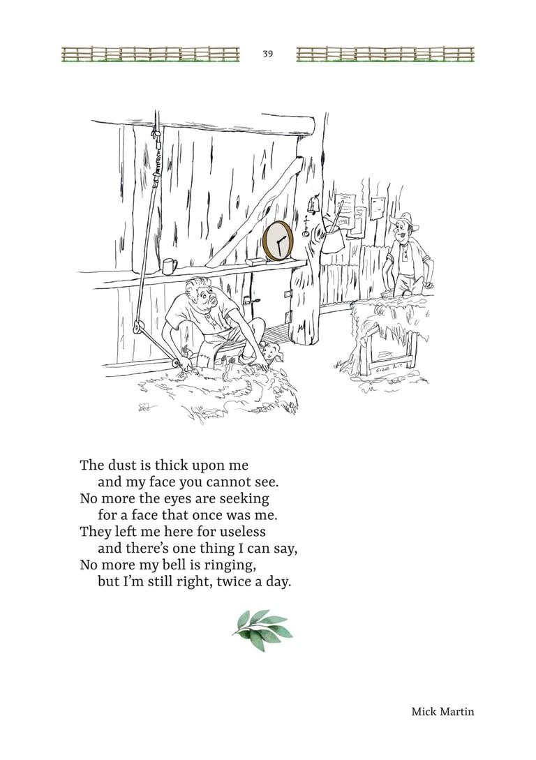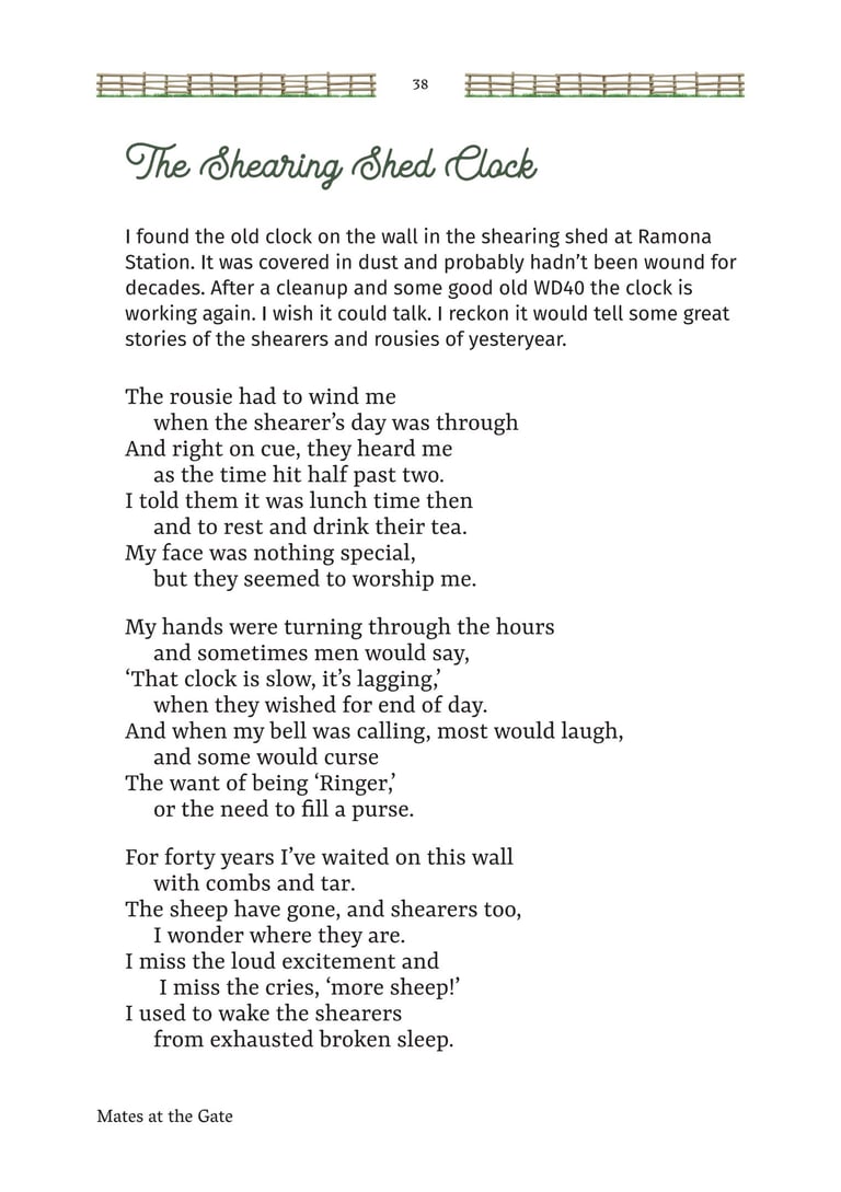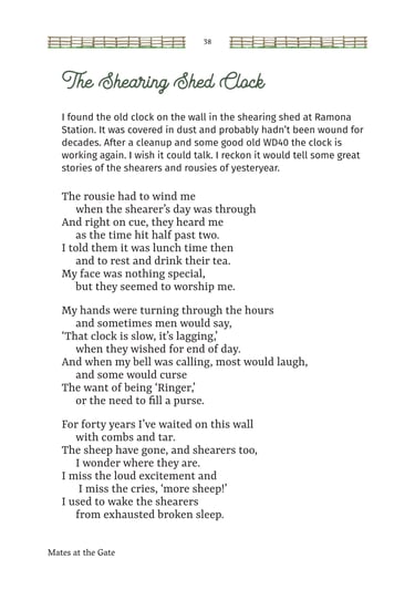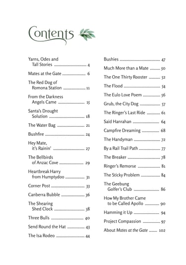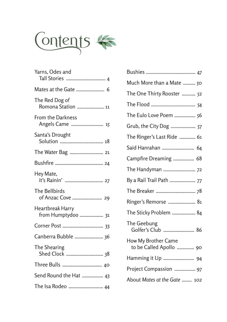 Mates at the Gate is a collection of Australian bush poetry and stories. Three stories and 25 poems were written by Mick Martin, with five poems written by Glenny Palmer, Jan Facey, Mal Beveridge, Henry Lawson and PJ Hartigan (John O’Brien). The introduction, Yarns, Odes & Tall Tales, was written by Rupert McCall.